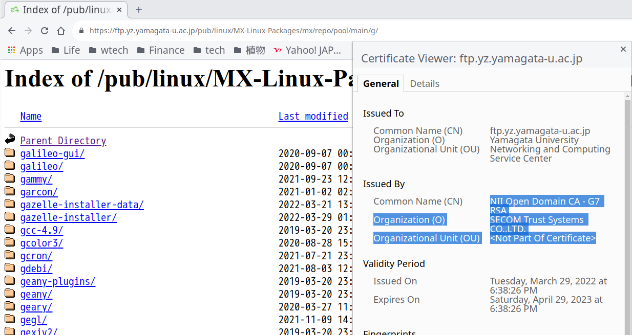 $ sudo apt update && sudo apt upgrade ... W: https://ftp.yz.yamagata-u.ac.jp/pub/Linux/MX-Linux-Packages/mx/repo/dists/bullseye/InRelease の取得に失敗しました Certificate verification failed: The certificate is NOT trusted. The certificate issuer is unknown. Could not handshake: Error in the certificate verification. [IP: 133.24.248.16 443] ... 続行しますか? [Y/n] n ... E: https://ftp.yz.yamagata-u.ac.jp/pub/Linux/MX-Linux-Packages/mx/repo/pool/main/t/timeshift/timeshift_21.09.1-1%7emx21%2b2_amd64.deb の取得に失敗しました Certificate verification failed: The certificate is NOT trusted. The certificate issuer is unknown. Could not handshake: Error in the certificate verification. [IP: 133.24.248.18 443]