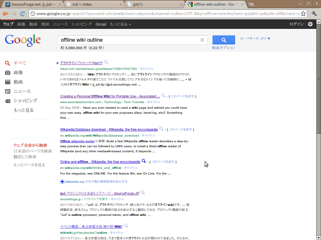 オフライン Wiki として有名なものに TiddlyWiki がある。 (例えば紹介記事: http://bizmakoto.jp/bizid/articles/0703/16/news142.html )。 ちょっと触ってみたけど、ブラウザ前提なので、入力がしにくい。 エディタ(jstar)に慣れているので、その点では手前味噌だけど juli がいいかな。